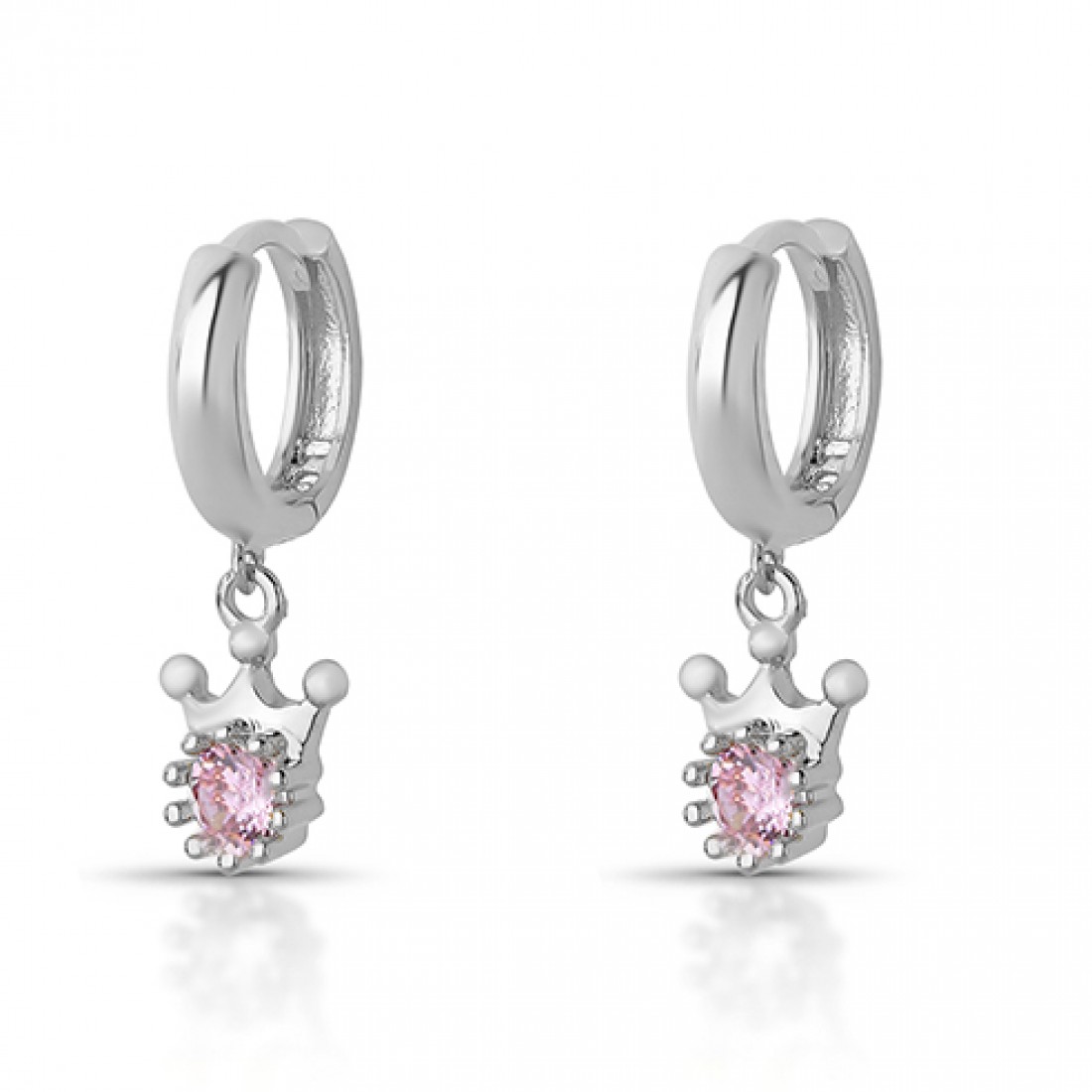 Brinco argola pequena com coroa zirconia rosa pendurada. 1535396..