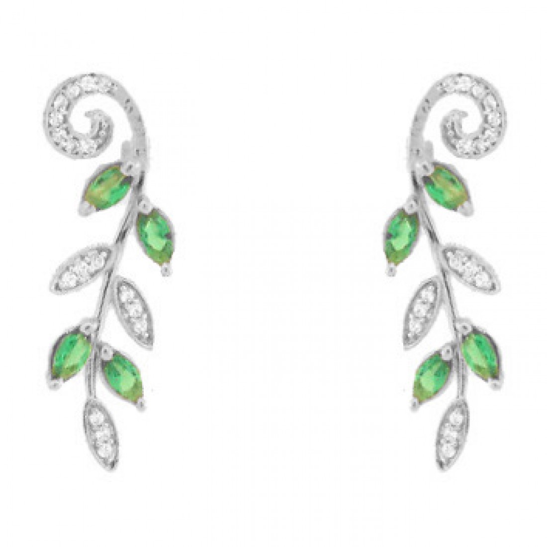 Brinco folhas navete verde e zirconia cristal, prata com banho de ouro. 151587..