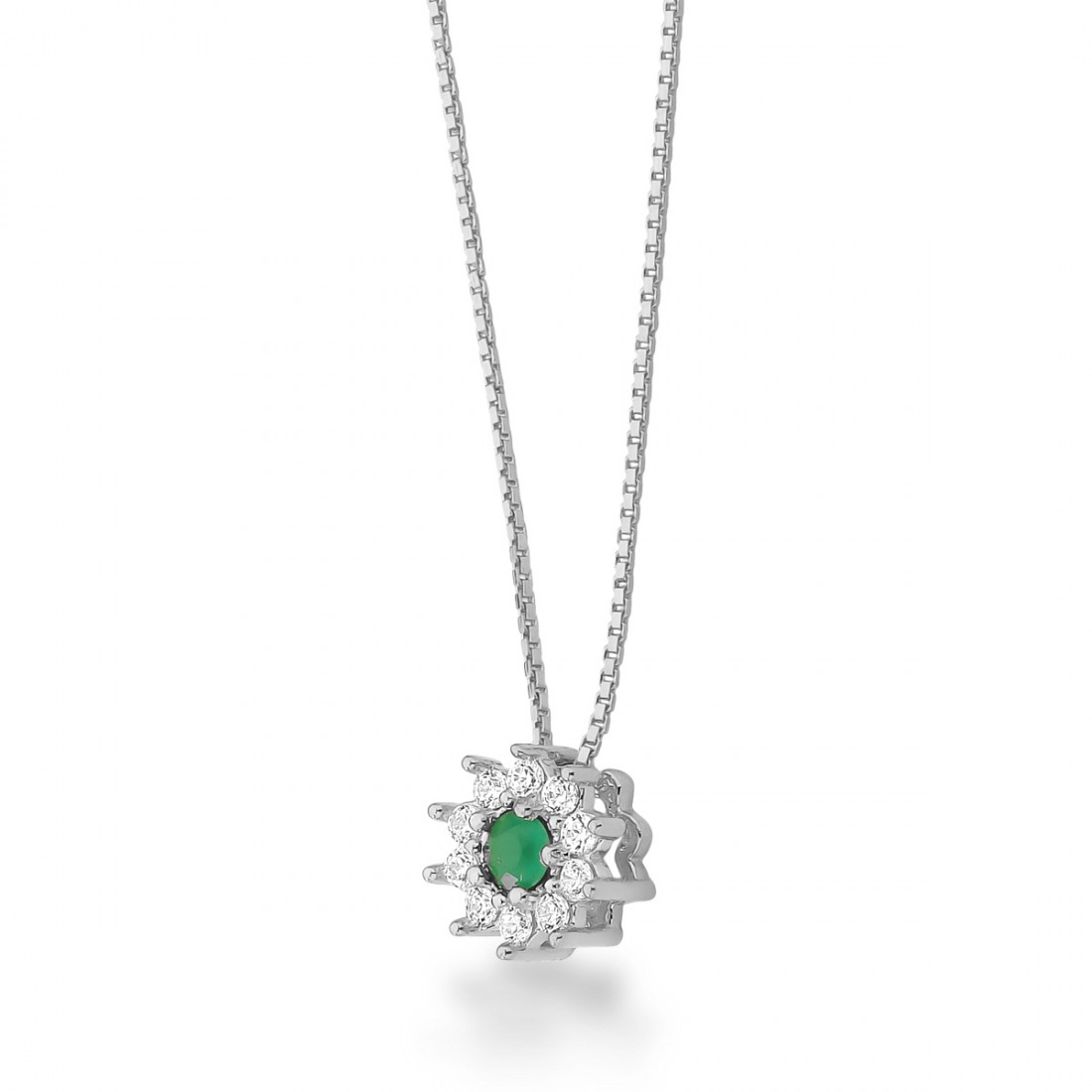 Colar flor pequena zirconia verde centro e cristal em volta, corrente 40cm. 3mm, prata. 3630238