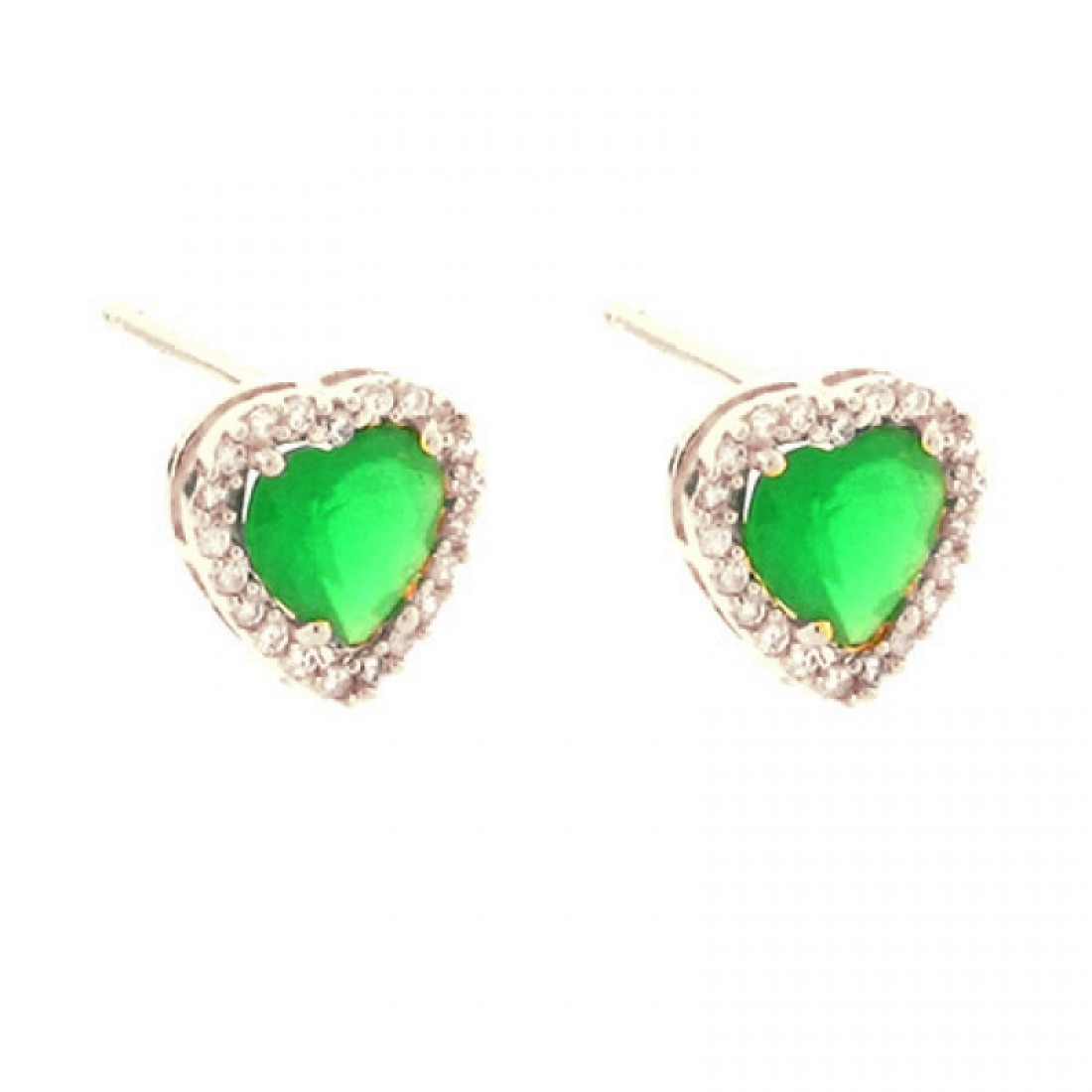 Brinco coracao pedra maior verde esmeralda com zirconia cristal em volta. 9.5x9.5mm. 151394