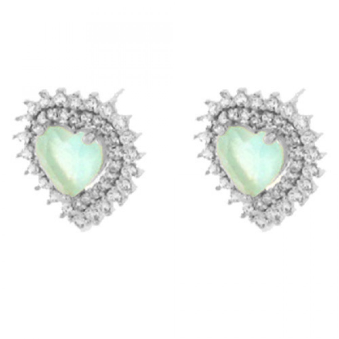 Brinco coracao pedra maior azul leitoso com zirconia cristal em volta, 13x12mm, Prata. 351594