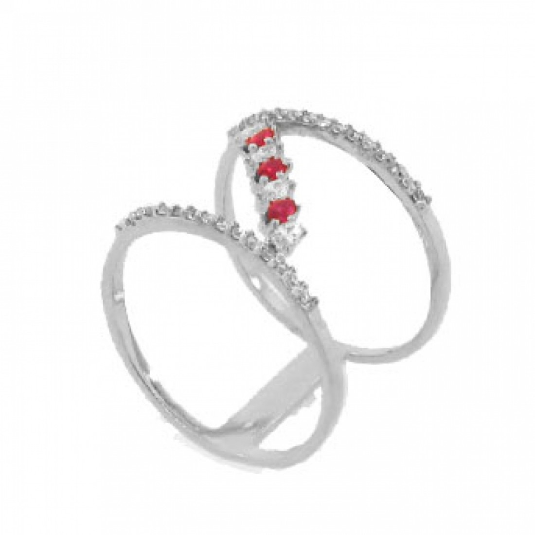 Anel fino vazado aro zirconia cristal, navete vermelha e cristal intercaldo, prata. 341351