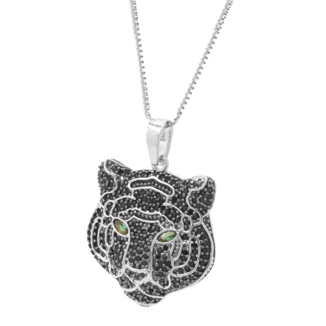 Colar tigre zirconia negra com olhos navete verde esmeralda, Prata. 361851