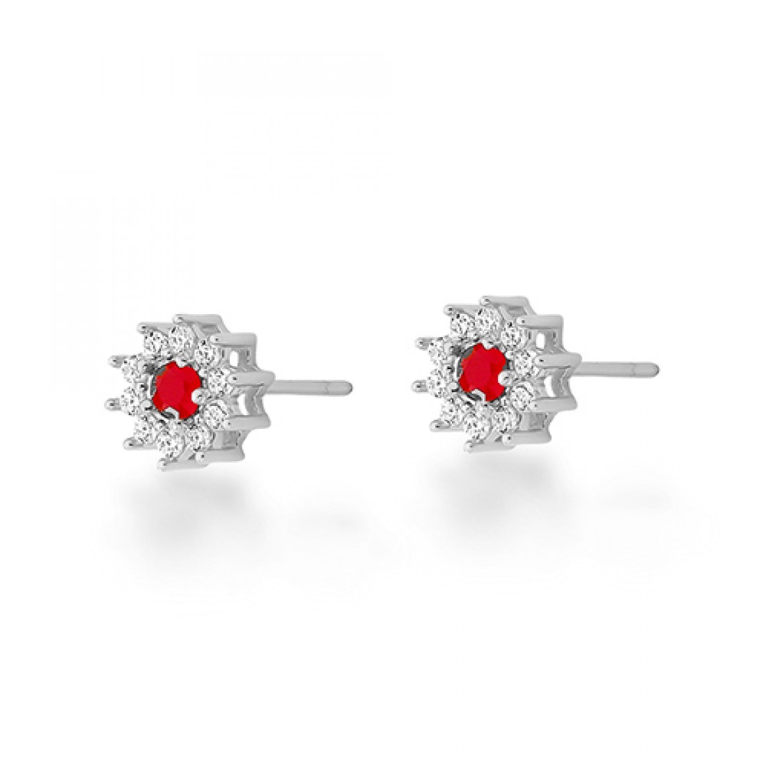 Brinco flor pequena miolo zirconia vermelho rubi e cristal em volta, prata com banho de ouro. 1530239..