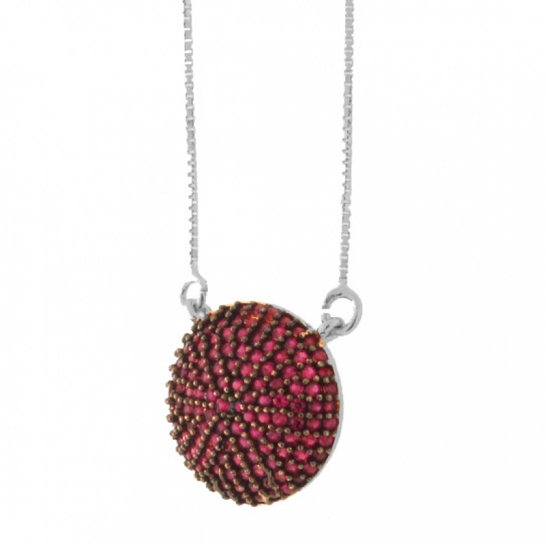 Colar redondo cravejado zirconia vermelha, prata com banho de ouro...