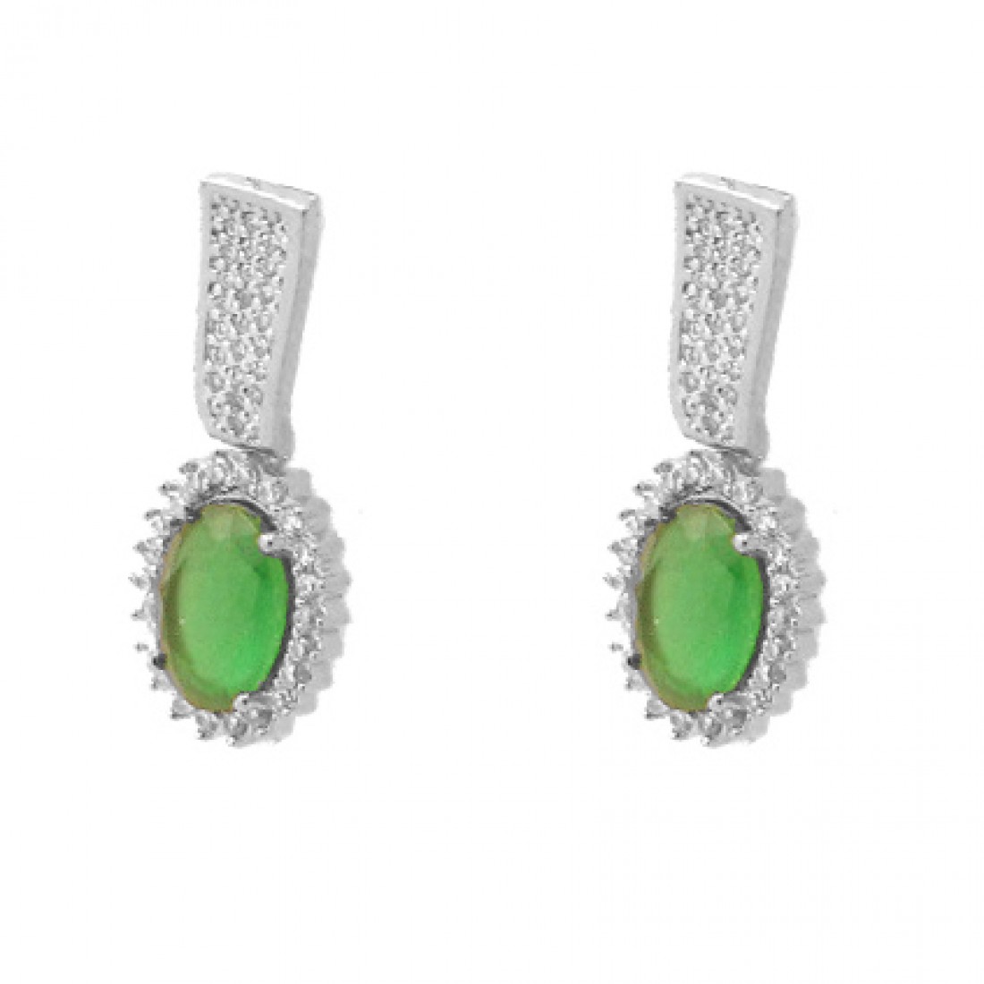 Brinco oval pedra maior verde esmeralda com zirconia cristal em volta e na haste, 20x8mm, Prata. 351609