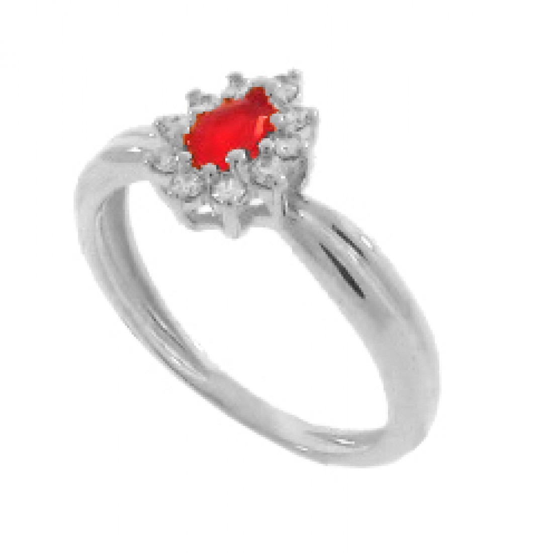 Anel gota pequena zirconia vermelho rubi no centro e cristal em volta, prata. 341414