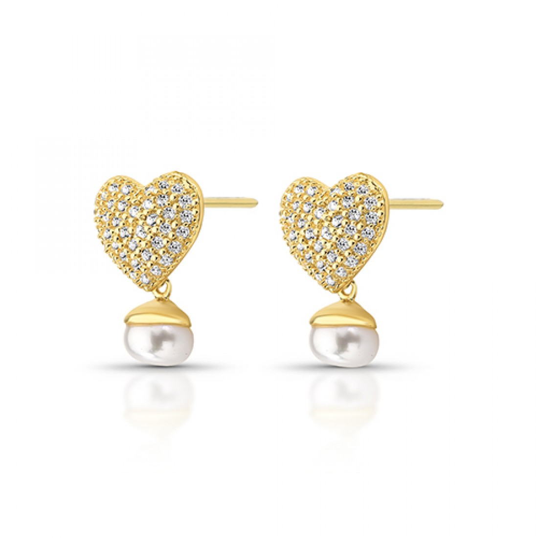 Brinco coracao com zirconia e perola, prata com banho de ouro. 1520570