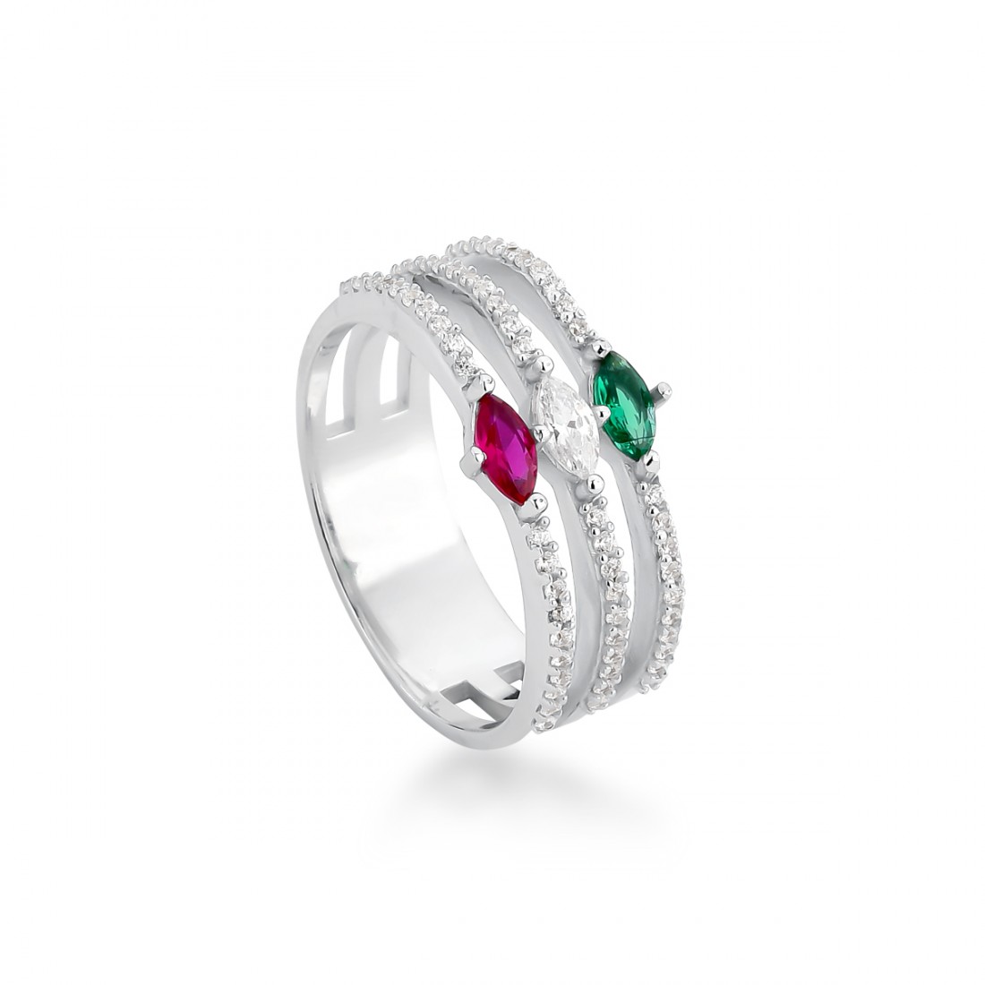 Anel 3 aros zirconia cristal com navetes vermelha, verde e cristal, prata. 340938