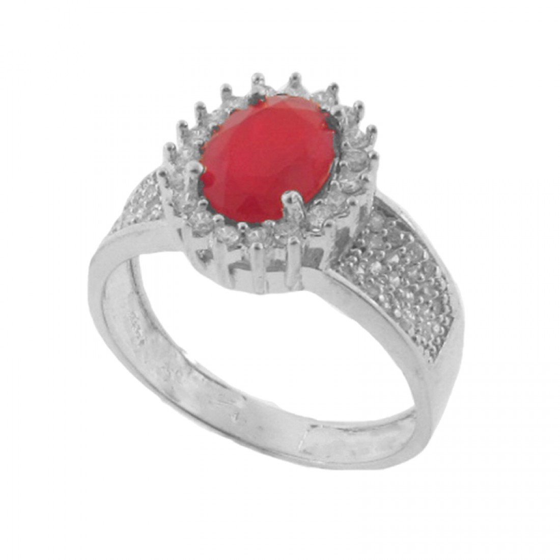 Anel oval pedra maior vermelho rubi com zirconia cristal em volta e nas laterais, Prata. 341381
